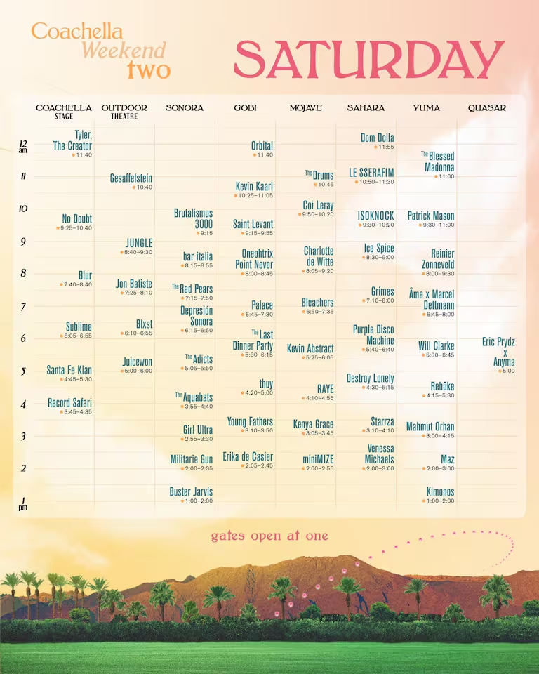 El sábado 20 de abril, la jornada musical comenzará con las actuaciones de Buster Jarvis y Kimonos, quienes tomarán el escenario Sonora y Yuma, respectivamente, para deleitar al público con su talento. Mientras tanto, en el escenario principal, la tarde arrancará con Récord Safari a las 15:45, seguido por el mexicano Santa Fe Klan a las 16:45. Más tarde, Sublime subirá al escenario a las 18:05, seguido de Blur a las 19:40. Sin duda, uno de los momentos más esperados será el turno de No Doubt a las 21:25, una banda que promete una actuación inolvidable. Finalizando la noche, Tyler The Creator ofrecerá su espectáculo a las 23:40, cerrando así un día lleno de emociones musicales.Todo lo podrás evr en el streaming de Youtube