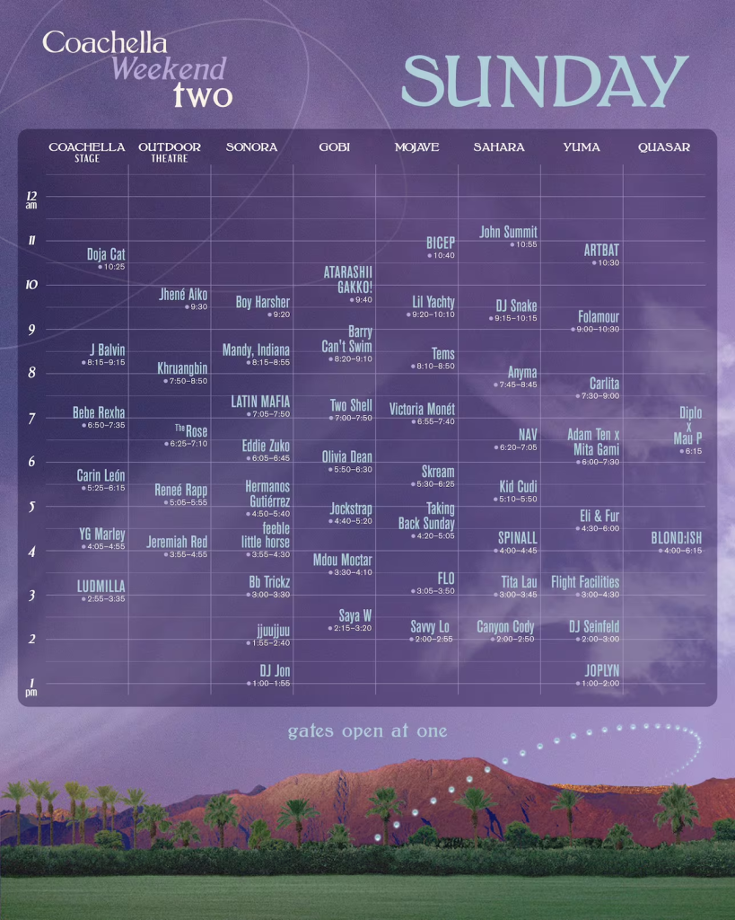 Here is the complete lineup for the last day of the second weekend and the festival: all the artists performing, schedules and stages. You can watch it all in streaming through the Coachella Channel on YouTube
